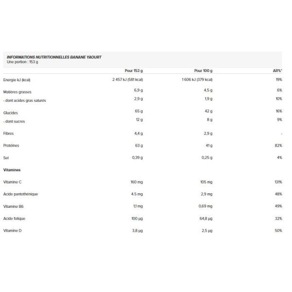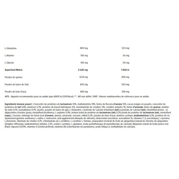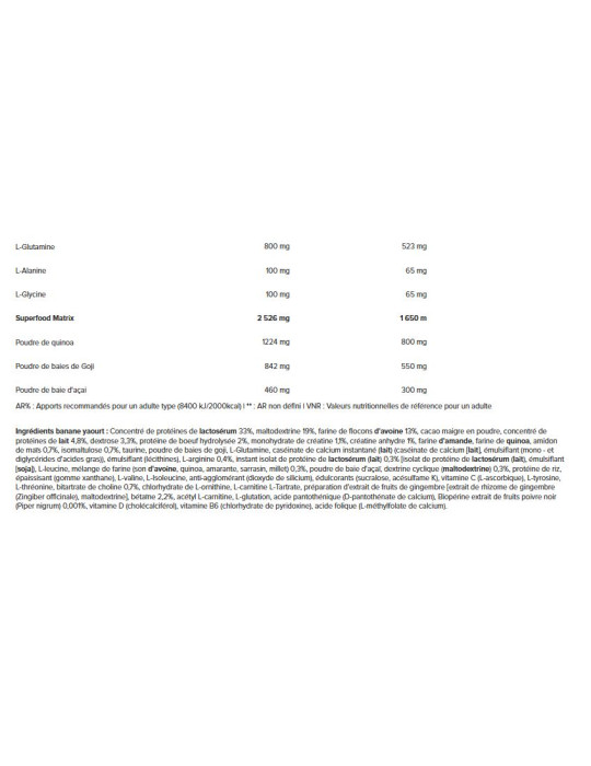 Ingredients banana yogurt :Protein concentrate from whey 33%, maltodextrin 19%, flake flour oats 13%, low-fat cocoa powder, protein concentrate from milk 4.8%, dextrose 3.3%, hydrolysed beef protein 2%, creatine monohydrate 1.1%, creatine anhydrous 1%, flour almond, flour quinoa, corn starch 0.7%, isomaltulose 0.7%, taurine, goji berry powder, L-glutamine, instant calcium caseinate (milk) (calcium caseinate [milk], emulsifier (mono - and diglycerides of fatty acids)), emulsifier (lecithins), L-arginine 0.4%, instant protein isolate of whey (milk) 0.3% [protein isolate from whey (milk), emulsifier [soy]), L-leucine, flour blend (bran oats, quinoa, amaranth, buckwheat, millet) 0.3%, acai berry powder, cyclic dextrin (maltodextrin) 0.3%, rice protein, thickener (xanthan gum), L-valine, L-Isoleucine, anti-caking agent (silicon dioxide), sweeteners (sucralose, acesulfame K), vitamin C (L-ascorbic acid), L-tyrosine, L-threonine, choline bitartrate 0.7%, L-ornithine hydrochloride, L-carnitine L-tartrate, ginger fruit extract preparation [extrait de rhizome de gingembre (Zingiber officinale), maltodextrine], betaine 2.2%, acetyl L-carnitine, L-glutation, pantothenic acid (calcium D-pantothenate), Bioperine black pepper fruit extract (Piper nigrum) 0.001%, vitamin D (cholecalciferol), vitamin B6 (pyridoxine hydrochloride), folic acid (calcium L-methylfolate).