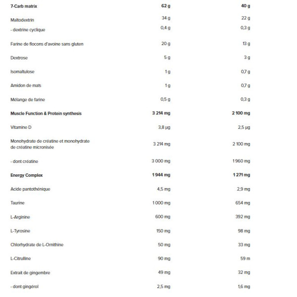 Ingredients Chocolate:Protein concentrate from whey 33%, Maltodextrin 19%, Flour flakes oats 13%, Defatted cocoa powder, Cocoa protein concentrate milk 4.8%, Flavours, Dextrose 3.3%, Medium chain triglyceride oil powder 2.8% [triglycérides à chaîne moyenne, agent de charge (gomme d'acacia), agent anti-agglomérant (dioxyde de silicium)], hydrolyzed beef protein 2%, creatine monohydrate 1.1%, creatine anhydrous 1%, flour almond, quinoa powder, corn starch 0.7%, PalatinoseTM (Isomaltulose*) 0.7%, taurine, goji berry powder, L-glutamine, calcium caseinate [(caseinate of calcium, emulsifier (mono- and diglycerides of fatty acids)], emulsifier (lecithins), magnesium carbonate, L-Arginine 0.4%, protein isolate of wheyinstantaneous 0.3% [protein isolate whey, emulsifier: lecithins (soy)], L-leucine, ModCarbTM flour blend 0.3% (bran oats, quinoa, amaranth, buckwheat, millet), acai berry powder, Cluster Dextrin® (maltodextrin) 0.3%, Rice Protein, Thickener (Xanthan Gum), L-Valine, L-Isoleucine, Sweeteners (Sucralose, Acesulfame K), Beta-Alanine 0.13%, L-Ascorbic Acid, L-Tyrosine, L-Threonine, Choline Bitartrate 0.07%, L-Lysine HCl, L-Glycine, L-Alanine, L-Phenylalanine, Inositol, L-Citrulline, L-Histidine, L-Methionine, L-Ornithine HCl, L-Carnitine-L-Tartrate, Ginger Extract [Extrait de Rhizome de Gingembre (Zingiber officinale), Maltodextrine], l-Tryptophan, Betaine, Acetyl-L-Carnitine HCl, L-Glutathione, Red clover (Trifolium pratensel ) leaf and flower extract, Sodium selenite, Zinc bisglycinate (zinc bisglycinate, glycine, acid (citric acid), anticaking agent (silicon dioxide)), D-pantothenate, calcium, BioPerine® black pepper (Piper Nigrum) fruit extract, cholecalciferol, pyridoxine hydrochloride, chromium picolinate, potassium iodide, calcium L-methylfolate. *Isomaltulose is a source of glucose and fructose.