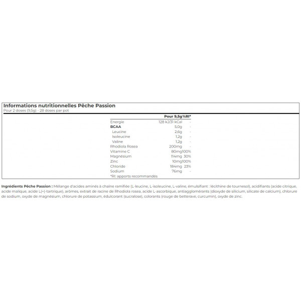 Ingredients Peach Passion : Mixture of branched-chain amino acids (L-leucine, L-isoleucine, L-valine, emulsifier : sunflower lecithin), acidifiers (citric acid, malic acid, L(+)-tartaric acid), flavourings, Rhodiola rosea root extract, L-ascorbic acid, anti-caking agents (silicon dioxide, calcium silicate), sodium chloride, magnesium oxide, potassium chloride, sweetener (sucralose), colorants (beet red, curcumin), zinc oxide.
