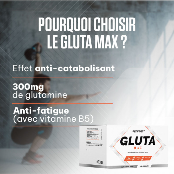 After each intense session, your muscles need support to rebuild stronger and faster. GLUTA MAX's pure L-glutamine (252 CAPS) helps recharge your reserves to ensure optimal and rapid recovery, while minimizing muscle breakdown.