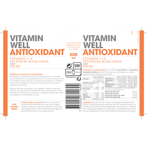 VITAMIN WELL ANTIOXIDANT is a complete formula containing vitamins C + E, selenium and manganese. VITAMIN WELL ANTIOXIDANT is available in a peach flavor, fresh and pleasant on the palate, a little like iced tea.