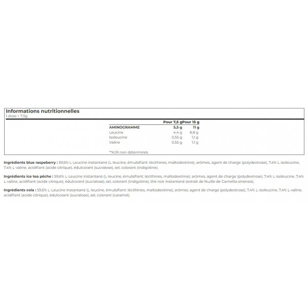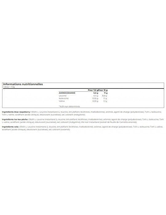 Ingredients blue raspeberry: 59.6% L-Leucine instant (L-leucine, emulsifier: lecithins, maltodextrin), flavourings, bulking agent (polydextrose), 7.4% L-isoleucine, 7.4% L-valine, acidifier (citric acid), sweetener (sucralose), salt, colouring (indigotine).
