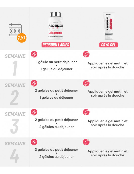 WEEK 2 (7d/7): Take 2 Redburn Ladies capsules at breakfast and 1 capsule at lunch. Apply Cryo Gel in the morning and evening after showering.