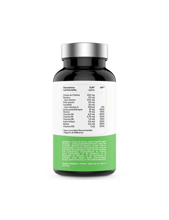 Ingredients : Choline citrate, K-Caps® vegetarian capsule (glazing agent: hydroxypropylmethylcellulose), dried Bamboo extract (Bambusa arundinacea, shoot), Horsetail powder (Equisetum arvense, aerial parts), dried Dunaliella extract (Dunaliella salina, thallus) 10% beta-carotene, pantothenic acid (calcium D-pantothenate), niacin (nicotinamide), vitamin B2 (riboflavin), vitamin B1 (thiamine hydrochloride), vitamin B6 (pyridoxine hydrochloride), folic acid (pteroylmonoglutamic acid), biotin (D-biotin), vitamin B12 (methylcobalamin).