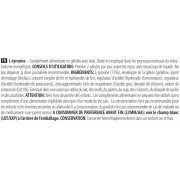 Ingredients: L-tyrosine (73%), capsule shell [gélatine, agent d’enrobage (shellac), colorant (oxydes de fer et hydroxydes de fer), régulateur d’acidité (hydroxyde d’ammonium), régulateur d’acidité (hydroxyde de potassium)], anti-caking agents (magnesium salts of fatty acids, silicon dioxide), potassium iodide (0.01%).
