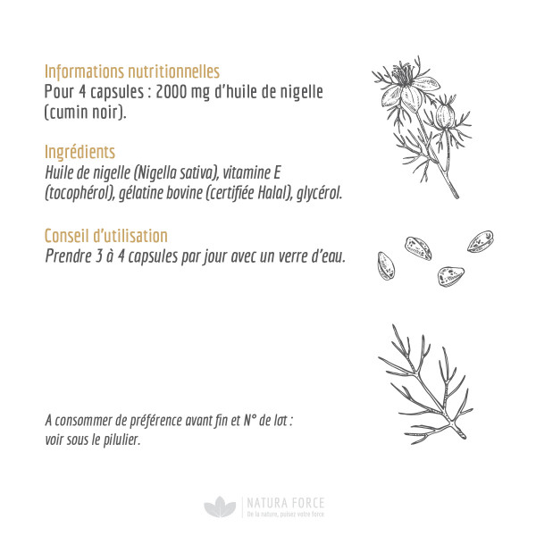 The product is composed of thymoquinone, an ingredient which, according to scientific research, has antioxidant, anti-inflammatory and anti-cancer properties. It is a priori capable of eliminating free radicals and preserving the body's antioxidant enzymes. In addition, this active ingredient stimulates cellular defense systems, protecting the liver from various toxins.