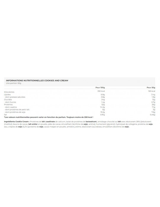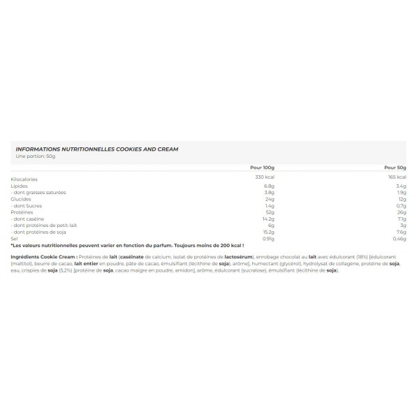 Cookie Cream ingredients: Milk proteins( calciumcaseinate, whey protein isolate), milk chocolate coating with sweetener (18%) [sweetener (maltitol), cocoa butter, whole milk powder, cocoa mass, emulsifier ( soya lecithin), flavor], humectant (glycerol), collagen hydrolysate, soy protein, water, soy crispies (5.2%) [ soy protein, low-fat cocoa powder, starch], flavor, sweetener (sucralose), emulsifier ( soy lecithin).
