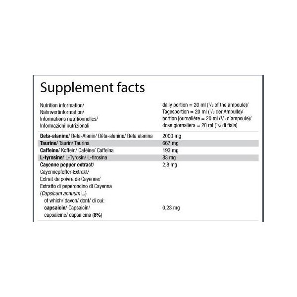NB: Caution: this dietary supplement contains a high dose of caffeine. In compliance with regulations, we advise you not to exceed 1/4 shot per day!