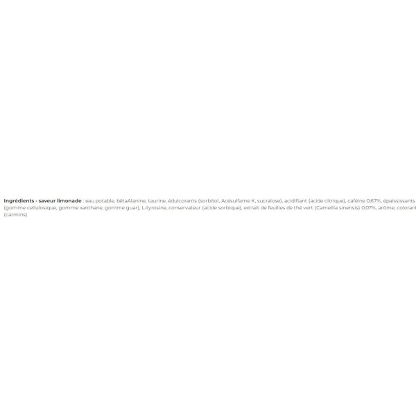 Ingredients - Lemonade flavour: drinking water, betaAlanine, taurine, sweeteners (sorbitol, Acesulfame K, sucralose), acidifier (citric acid), caffeine 0.67%, thickeners (cellulose gum, xanthan gum, guar gum), L-tyrosine, preservative (sorbic acid), green tea leaf extract (Camellia sinensis) 0.07%, flavour, color (carmine)