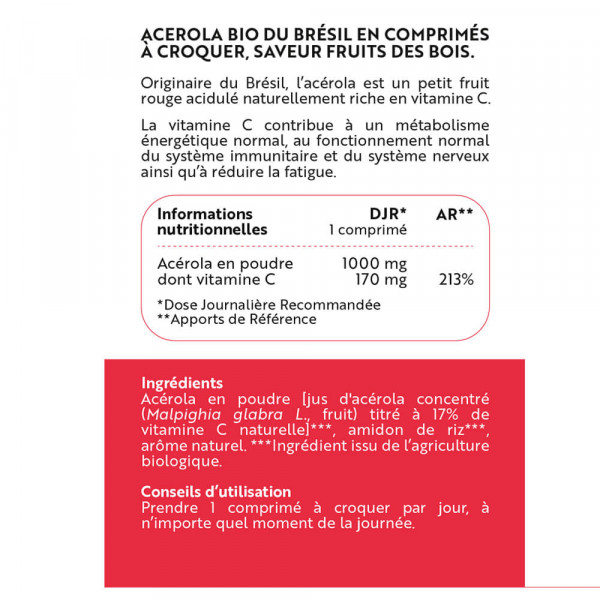 Acerola is a small, tart red fruit naturally rich in vitamin C. 1 organic Acerola tablet (60 caps) contains 1000mg acerola, including 170mg vitamin C.