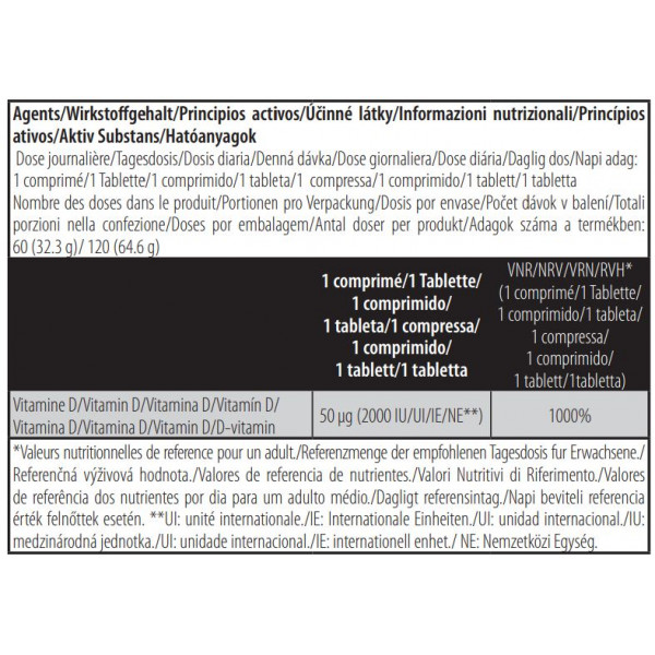 Ingredients: bulking agent (cellulose gel), cholecalciferol, coating [stabilisants (copolymère greffé d’alcool polyvinylique et de polyéthylèneglycol, alcool polyvinylique), anti-agglomérants (talc, mono- et diglycérides d’acides gras)], anti-caking agent (silicon dioxide, magnesium salts of fatty acids).