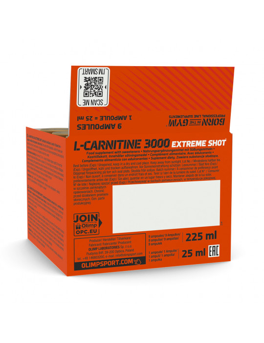 The l-carnitine 3000 extreme shot box (9X25ml) contains 9 shots of L-carnitine, 25ml each, from the brand Olimp Sport Nutrition. This dietary supplement is designed for people who want to slim down and reshape their figure.