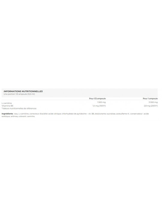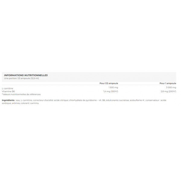 Ingredients : water, L-carnitine, acidity regulator: citric acid; pyridoxine hydrochloride - vit. B6, sweeteners: sucralose, acesulfame-K; preservative: sorbic acid, flavoring, color: carmine.