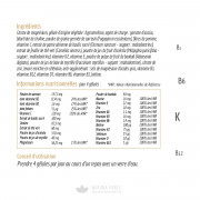 Ingredients: magnesium citrate; capsule of plant origin: hydroxypropylmethylcellulose; bulking agent: acacia gum; choline bitter; sprouted buckwheat seed powder (Fagopyrum esculentum); apple fiber; vitamin C; holy basil aerial part extract (Ocimum sanctum - carrier : maltodextrin); green tea leaf extract (Camelia sinensis); acerola fruit extract (Malpighia punicifolia - carrier maltodextrin); baobab fruit pulp powder (Adansonia digitata); bilberry berry extract (Vaccinium myrtillus - carrier : maltodextrin); vitamin E; zinc cirate; vitamin K2; selenium-enriched yeast; anti-caking agent: magnesium fatty acid salt; niacin; vitamin B12; vitamin D; vitamin B6; vitamin B1; biotin.