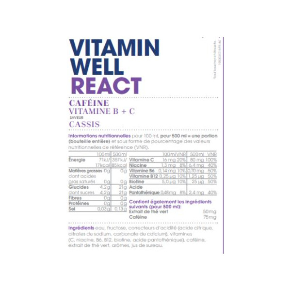 Ingredients: water, fructose, acidity regulators (citric acid, sodium citrates, calcium carbonate), vitamins (C, niacin, B6, B12, biotin, pantothenic acid), caffeine, green tea extract, flavourings, elderberry juice.