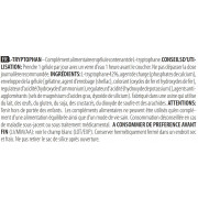 Ingredients: : L-tryptophan 42%, bulking agent (calcium phosphates), capsule shell [gélatine, agent d’enrobage (shellac), colorant (oxydes de fer et hydroxydes de fer), régulateur d’acidité (hydroxyde d’ammonium), régulateur d’acidité (hydroxyde de potassium)], anti-caking agents (magnesium salts of fatty acids, silicon dioxide).