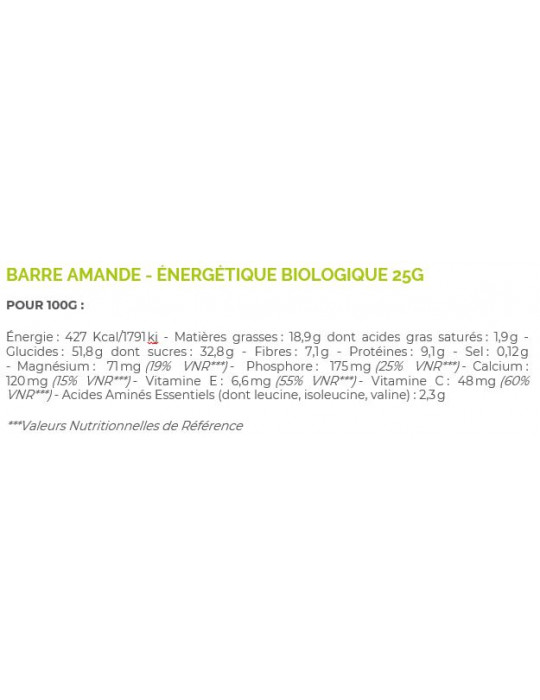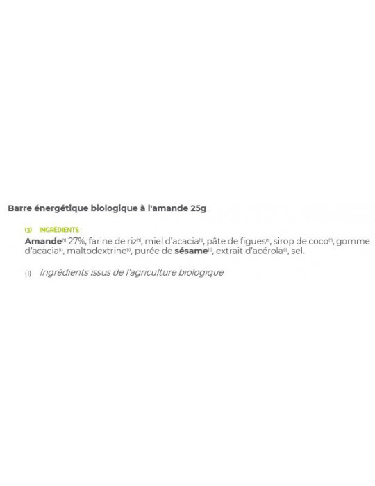 Ingredients: Almond(1) 27%, rice flour(1), acacia honey(1), fig paste(1), coconut syrup(1), acacia gum(1), maltodextrin(1), sesame puree(1), acerola extract(1), salt. (1) Ingredients proceeding from organic farming
