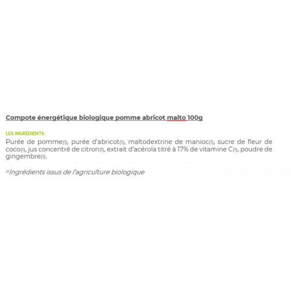 Ingredients Apple & Apricot: Apple puree 61% (1), apricot puree 22% (1), manioc maltodextrin(1), coconut blossom sugar(1), concentrated lemon juice(1), acerola extract titrated to 17% vitamin C(1), ginger powder(1). (1)Ingredients proceeding from organic farming