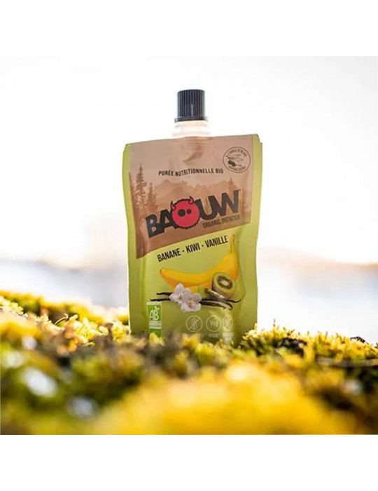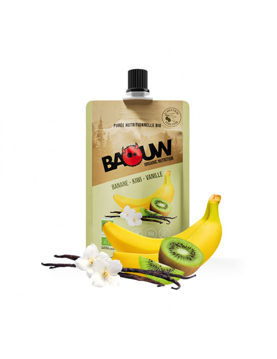 Ingredients BANANA-KIWI-VANILLA: banana puree 62.47%, kiwi puree 32%, extra virgin olive oil 4%, lime juice, vanilla extract 0.03%.