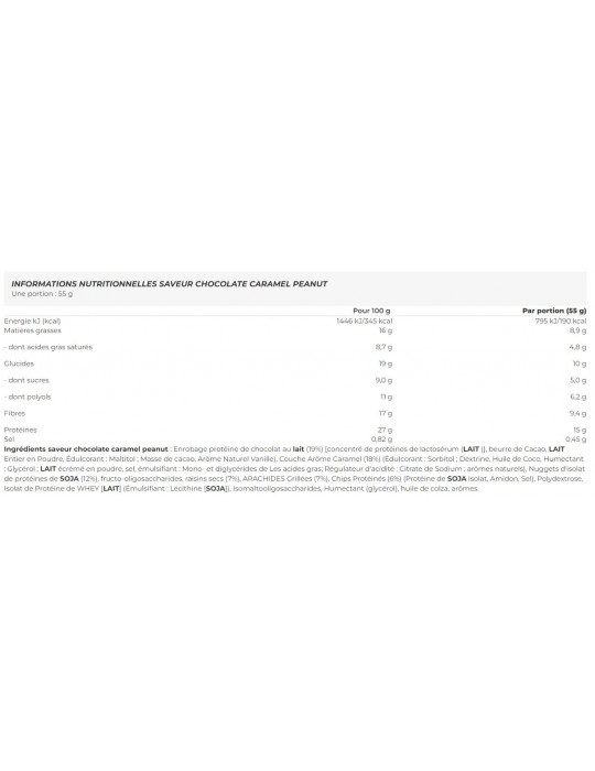 Ingredients chocolate caramel peanut flavor Chocolate protein coating milk(19%) [whey protein concentrate (MILK)], Cocoa butter, MILK Whole Powder, Sweetener : Maltitol; Cocoa Mass, Natural Vanilla Flavor), Caramel Flavor Layer (18%) (Sweetener: Sorbitol; Dextrin, Coconut Oil, Humectant: Glycerol; MILK skimmed powder, salt, emulsifier : Mono- and diglycerides of fatty acids; Acidity regulator: Sodium Citrate; Natural flavours), Protein isolate nuggets of SOJA (12%), fructo-oligosaccharides, raisins (7%), Roasted ARACHIDES (7%), Protein Chips (6%) (Protein of SOJA Isolate, Starch, Salt), Polydextrose, WHEY [MILK] (Emulsifier : Lecithin [SOJA]), Isomaltooligosaccharides, Humectant (glycerol), rapeseed oil, flavorings.