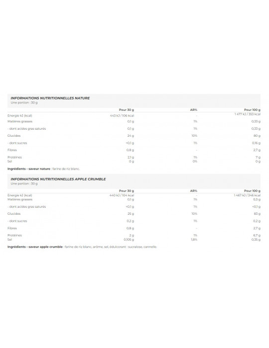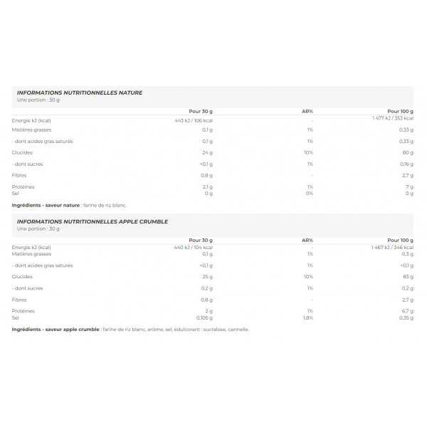 Ingredients - apple crumble flavourWhite rice flour, flavouring, salt, sweetener: sucralose, cinnamon.
