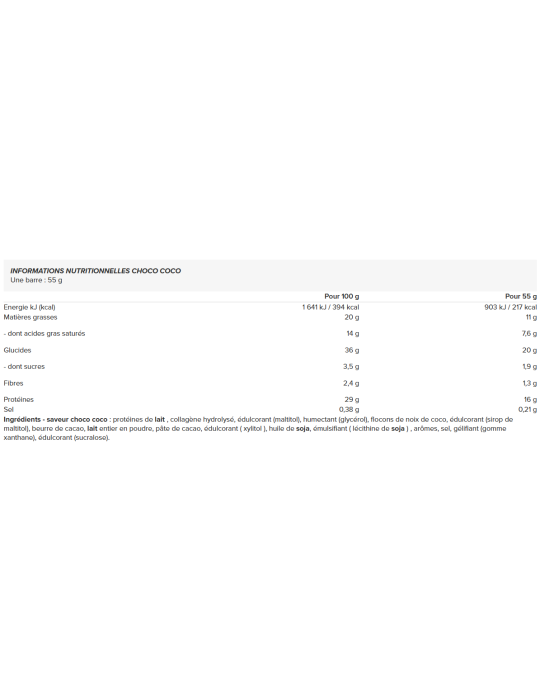 Ingredients - choco coco flavour: milk protein, hydrolyzed collagen, sweetener (maltitol), humectant (glycerol), coconut flakes, sweetener (maltitol syrup), cocoa butter, whole milk powder, cocoa mass, sweetener (xylitol), soya oil, emulsifier (soya lecithin), flavourings, salt, gelling agent (xanthan gum), sweetener (sucralose).