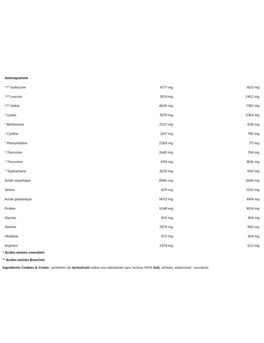 IngredientsCookies & Cream :Proteins whey native non-denatured 100% lactose-free (milk), flavorings, sweetener: sucralose.