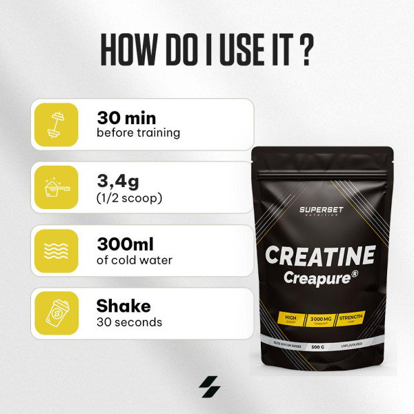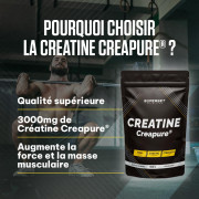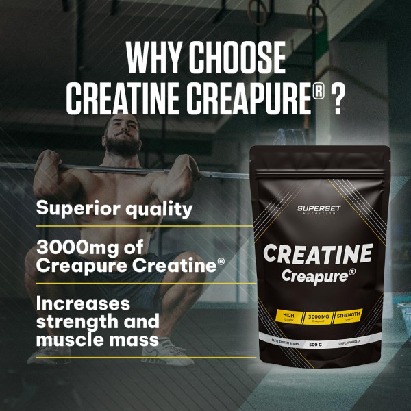 Creapure® CREATINE MONOHYDRATE (500G) is a micronized creatine developed by the brand's nutrition experts Superset Nutrition. It is distinguished by its micronization process, which considerably reduces particle size, making them 10 to 20 times smaller than traditional creatine, thus improving solubility and digestibility for optimal absorption.