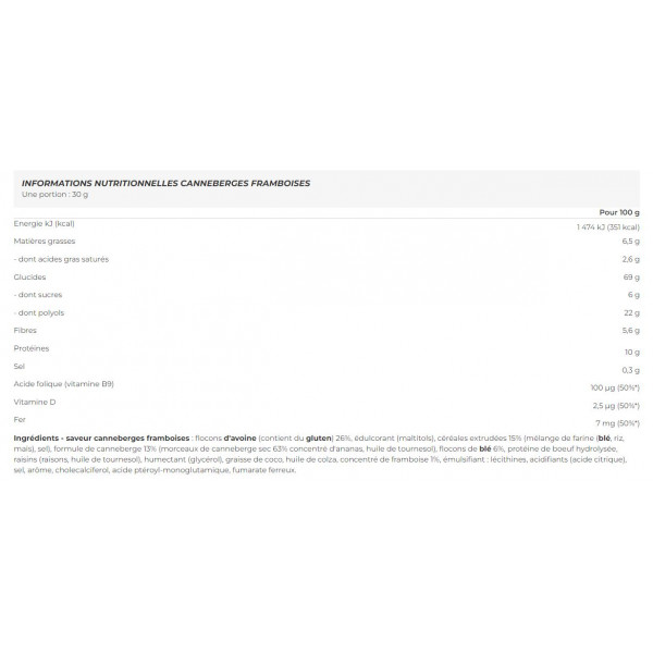 Ingredients - cranberry-raspberry flavour : oat flakes (contains gluten) 26%, sweetener (maltitols), extruded cereals 15% (flour blend(wheat, rice, corn), salt), cranberry formula 13% (dried cranberry pieces 63% pineapple concentrate, sunflower oil), wheat flakes 6%, hydrolysed beef protein, grapes (raisins, sunflower oil), humectant (glycerol), coconut fat, rapeseed oil, raspberry concentrate 1%, emulsifier : lecithins, acidifying agents (citric acid), salt, flavoring, cholecalciferol, pteroylmonoglutamic acid, ferrous fumarate.