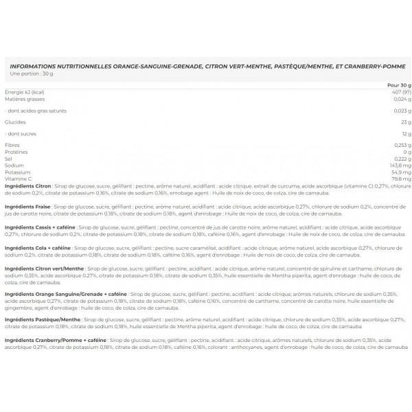Ingredients Blood Orange/Grenade + caffeine: Glucose syrup, sugar, gelling agent: pectin, acidifying agent: citric acid, natural flavoring, sodium chloride 0.35%, ascorbic acid 0.27%, potassium citrate 0.18%, sodium citrate 0.18%, caffeine 0.16%, safflower concentrate, black carrot concentrate, ginger essential oil, glazing agent: coconut oil, rapeseed oil, carnauba wax.