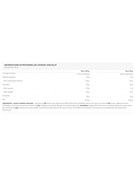Ingredients - Chocolate Cookies flavor: whole milk chocolate with sweetener (28%) (Sweetener (Maltitol), Cocoa butter, Whole milk powder, Cocoa mass, Emulsifier (Lecithins), Flavouring), Milk protein, Hydrolysed collagen (Beef), Humectant (Glycerol), Roasted peanuts (9%), Sweetener (Maltitol), Cocoa mass, Soy protein isolate, Roasted cocoa nibs, Sunflower oil, Cocoa butter, Flavour, Emulsifier (Lecithins1), Defatted cocoa powder, Salt, Sweetener (Sucralose).