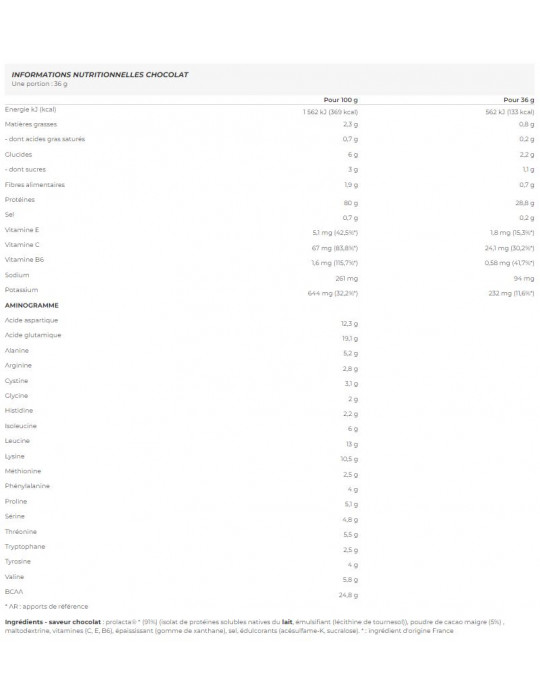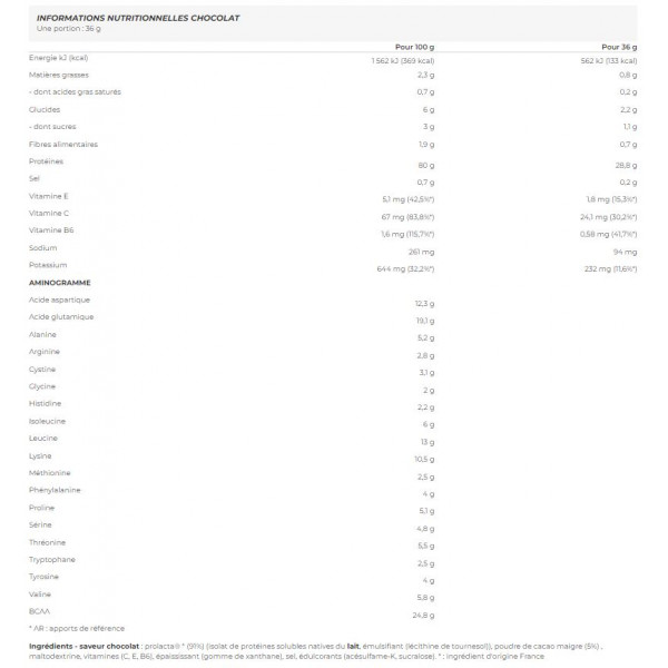 Ingredients - chocolate flavour: prolacta® * (91%) (native soluble milk protein isolate, emulsifier (sunflower lecithin)), low-fat cocoa powder (5%) , maltodextrin, vitamins (C, E, B6), thickener (xanthan gum), salt, sweeteners (acesulfame-K, sucralose). * ingredients of French origin