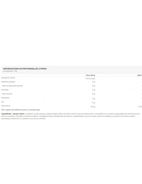 Ingredients - lemon flavor : acidifier, citric acid, malic acid, inulin fiber, natural flavor, sweeteners: acesulfame K, sucralose, steviol glycosides from stevia, acidity regulator, sodium citrate, anticaking agent, calcium phosphate, thickeners, guar gum, gum arabic or acacia gum, l-ascorbic acid (vitamin C), curcumin color, flavor.