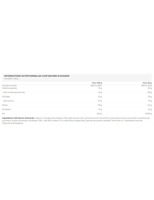 Ingredients Coffee almond butter :dates*, shelled almonds* 18%, apple paste* (concentrated apple juice*, concentrated apple puree*), sunflower protein*, whole almond puree* 5.9%, coffee 100% arabica* 4%,extra virgin olive oil*,toasted buckwheat seeds*, rice flour*. *Organic ingredients.