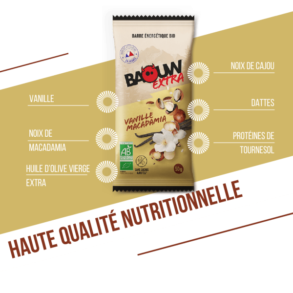Your Baouw extra bar is designed for sport, containing the energy you need for around an hour's effort. You'll find up to 198 kcal and 25 g of carbohydrates per bar, depending on the flavor. They are designed with no added sugar, and only sugars naturally present in the fruit and ingredients. This energy bar is ideal during or after your sports session, but also as a healthy snack at any time of day. It's proof that a high-performance, healthy and delicious bar is possible! Extra energy bars accompany you throughout your intensive, daily training, long outings and endurance training.