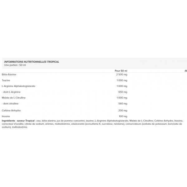 Ingredients - Tropical flavor: water, beta-alanine, apple juice concentrate, taurine, L-Arginine Alphaketoglutarate, L-Citrulline Malate, Caffeine Anhydrous, Inosine, acidity regulator, sodium citrate, flavors, maltodextrin, sweeteners (acesulfame K, sucralose, neotame), preservatives (potassium sorbate, sodium benzoate), maltodextrin.