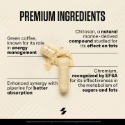 Ingredients: chitosan (shellfish) 47%, green coffee bean extract (Coffea robusta) 18%, bulking agents (cellulose gel, calcium phosphates), capsule shell (gelatin), anti-caking agents (magnesium salts of fatty acids, silicon dioxide), black pepper fruit extract (Piper nigrum) 0,068%, chromium (III) chloride.