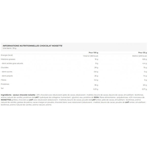 Ingredients - Chocolate hazelnut flavor23% chocolate with sweetener (cocoa mass, sweetener: maltitol, cocoa butter, cocoa butter, emulsifier: lecithin, natural vanilla flavouring), protein from MILK, collagen hydrolysate, humectant: glycerol, water, collagen protein SOJA, dietary fibre: polydextrose, 4.5% pieces of NOISETTES grilled, chocolate MILK with sweetener (sweetener: maltitols, cocoa butter, cocoa powder) MILK cocoa mass, emulsifier: lecithins, natural vanilla flavouring), palm fat, low-fat cocoa powder, white chocolate with sweetener (sweetener: maltitol, cocoa butter, cocoa powder) MILK whole, emulsifier: lecithins, natural vanilla flavor), natural flavor, flavor.