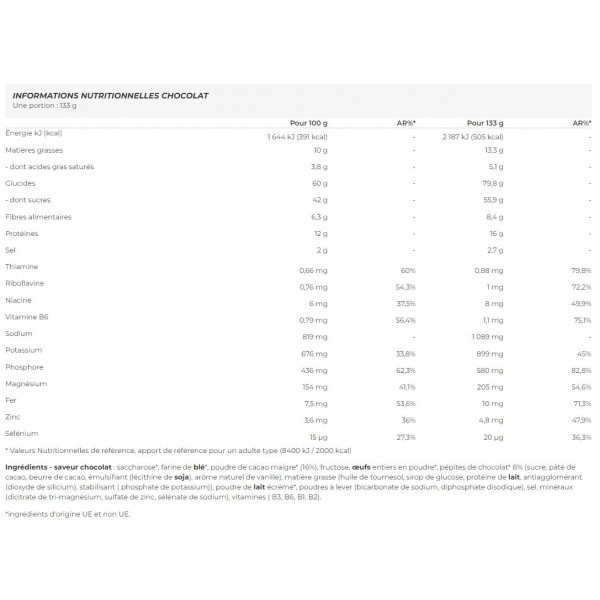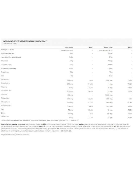 Ingredients - chocolate flavour: sucrose*, wheat flour*, low-fat cocoa powder* (16%), fructose, whole egg powder*, chocolate chips* 8% (sugar, cocoa mass, cocoa butter, emulsifier ( soya lecithin), natural vanilla flavor), fat (sunflower oil, glucose syrup, milk protein, anti-caking agent (silicon dioxide), stabilizer (potassium phosphate)), skim milk powder*, raising agents (sodium bicarbonate, disodium diphosphate), salt, minerals (tri-magnesium dicitrate, zinc sulfate, sodium selenate), vitamins ( B3, B6, B1, B2).