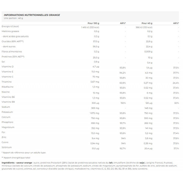 Ingredients - Orange flavorSugar, Prolacta® protein (28%) (native soluble protein isolate from milk, emulsifier (lecithin from soy), (French origin), fructose, minerals (calcium lactate, potassium citrate, potassium phosphate, sodium, magnesium citrate, iron pyrophosphate, zinc sulfate, sodium selenate, copper gluconate), flavoring, salt, acidity regulator (citric acid), maltodextrin, vitamins (C, E, B3, D3, B6, B2, B1 and B9), beta-carotene.