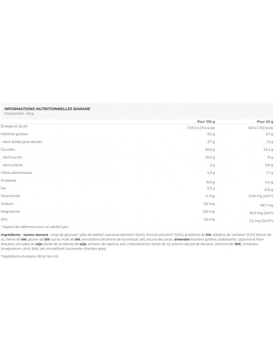 Ingredients - banana flavor: glucose syrup*, date paste*, dried bananas* (9.4%), rolled oats* (9.3%), wheat protein, cereal billets* (5.1%) (rice flour, wheat flour, wheat gluten, sugar, wheat malt, emulsifier (sunflower lecithin), salt), cocoa butter, chopped roasted almonds, stabilizers : glycerol and acacia fiber, soy extrudates ( soy protein isolate, tapioca starch, salt), maltodextrin, rice flour, natural banana flavor, vitamin B1(wheat), minerals (magnesium, zinc) (wheat), salt, emulsifier (fatty acid sucroester).