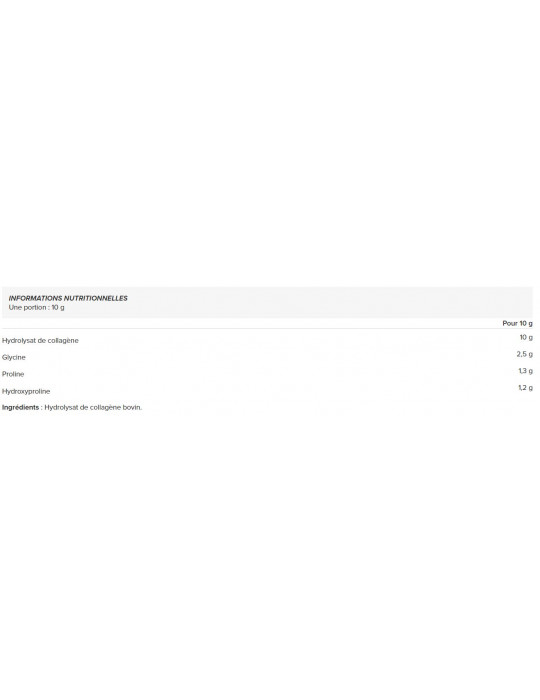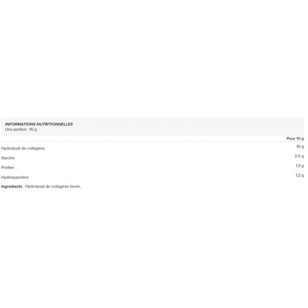 Each serving contains 10g of marine collagen peptides, enriched with 2.5g of glycine. Glycine is recognized for its beneficial effects in reducing inflammation and accelerating the restructuring of collagen molecules.