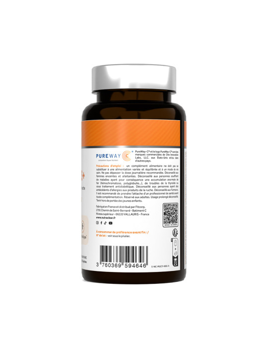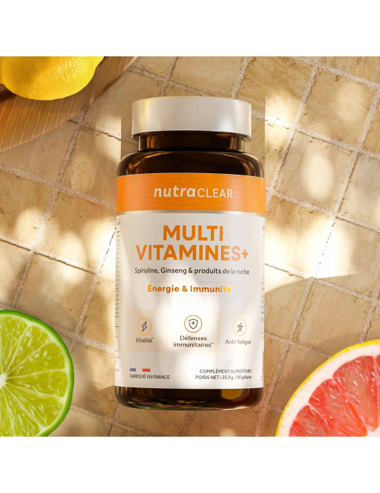 Regain energy and vitality with Multivitamines+ from French brand Nutraclear, a complete formula combining 22 natural active ingredients: vitamins, minerals, spirulina, ginseng and beehive products. Enriched with PureWay-C® vitamin C, it ensures optimal absorption for maximum effect.