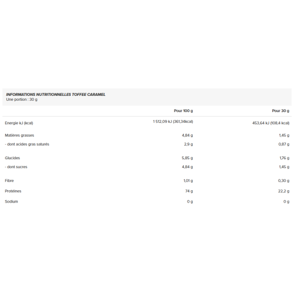 IngredientsToffee Caramel:Proteins whey native non-denatured 100% lactose-free (milk), flavorings, sweetener: sucralose.