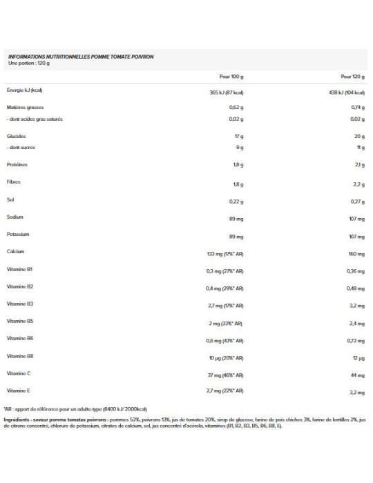 Ingredients - apple-tomato-pepper flavor: apples 52%, peppers 13%, tomato juice 20%, glucose syrup, chickpea flour 3%, lentil flour 2%, concentrated lemon juice, potassium chloride, calcium citrates, salt, concentrated acerola juice, vitamins (B1, B2, B3, B5, B6, B8, E).