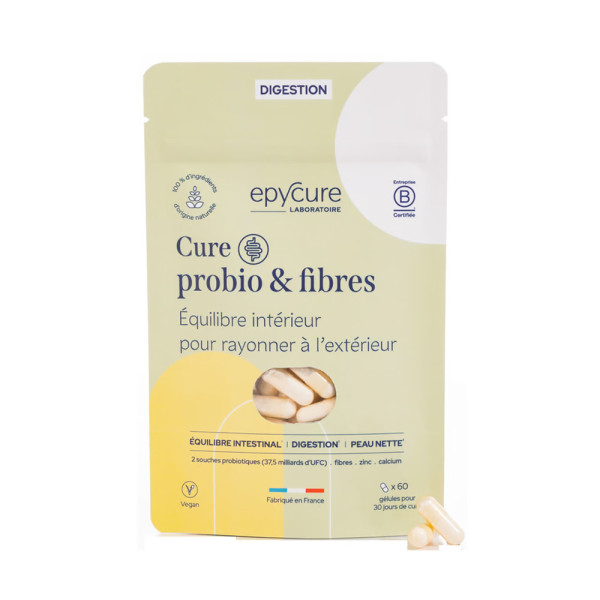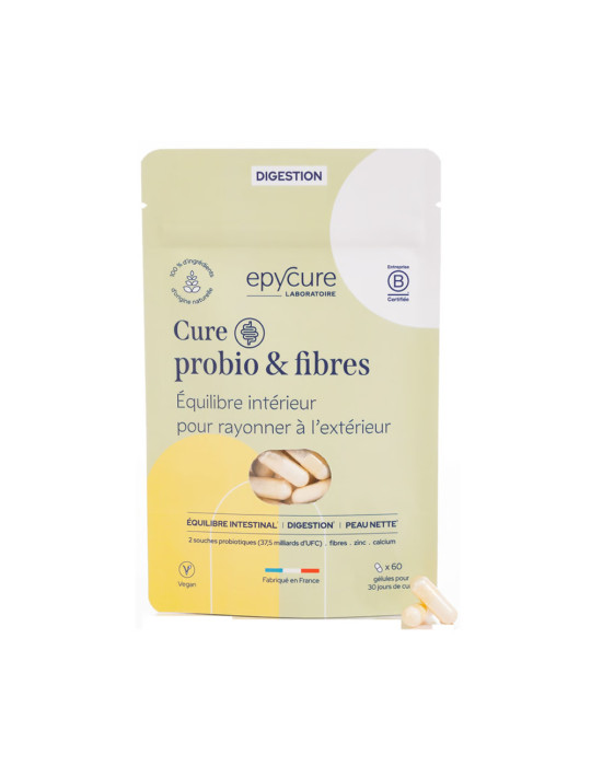 Epycure's Cure Probio & Fibres (60caps) combines ultra-concentrated probiotics (37.5 billion CFU), a prebiotic and essential minerals, to effectively rebalance your microbiota. Its innovative formula, consisting of gastro-resistant capsules, protects probiotics until they reach the intestine, without the need to take them on an empty stomach.