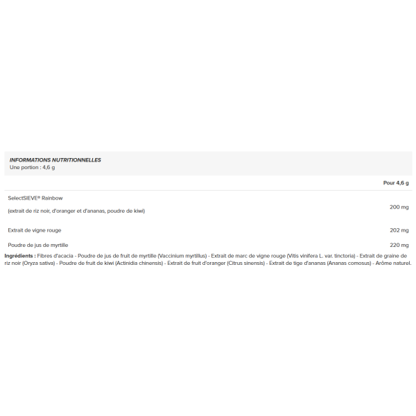 Ingredients : Acacia fibres - Bilberry fruit juice powder (Vaccinium myrtillus) - Red vine marc extract (Vitis vinifera L. var. tinctoria) - Black rice seed extract (Oryza sativa) - Kiwi fruit powder (Actinidia chinensis) - Orange fruit extract (Citrus sinensis) - Pineapple stem extract (Ananas comosus) - Natural flavour.