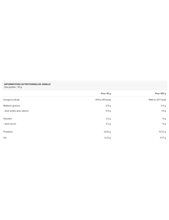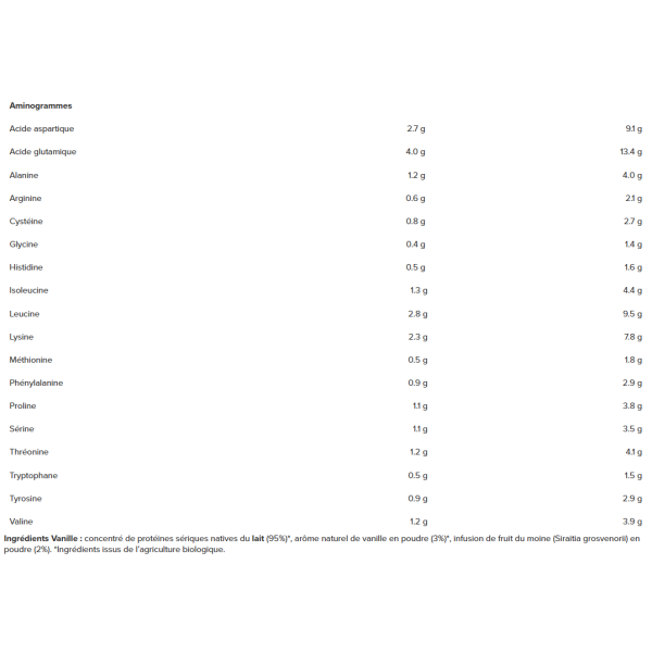 Ingredients - Vanilla flavor: native serum milk protein concentrate (95%)*, natural vanilla flavor powder (3%)*, monk fruit infusion (Siraitia grosvenorii) powder (2%). *Ingredients from organic farming.