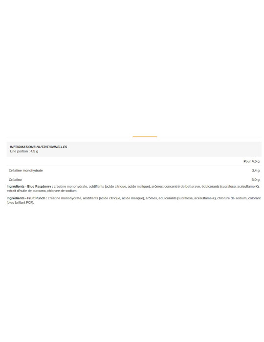 Ingredients - Fruit Punch : creatine monohydrate, acidulants (citric acid, malic acid), flavourings, sweeteners (sucralose, acesulfame-K), sodium chloride, color (brilliant blue FCF).