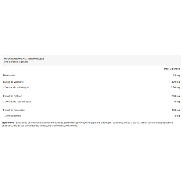 Ingredients: dried valerian extract (valeriana officinalis), vegetable capsule (coating agent: pullulan), acacia fibre, dried lemon balm extract (melissa officinalis), dried chamomile extract (matricaria chamomilla), melatonin.